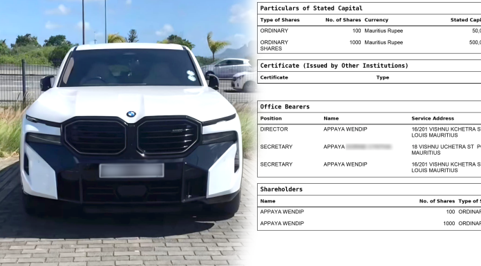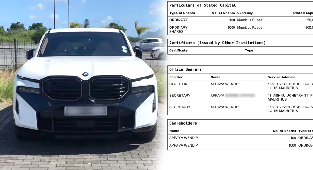 Nos recherches ont révélé que le véhicule aperçu sur une aire de stationnement à Grand Baie est enregistré au nom d’une entreprise spécialisée dans le nettoyage. Wendip Appaya y figure comme directeur et unique actionnaire, une information corroborée par un document du Registrar of Companies.